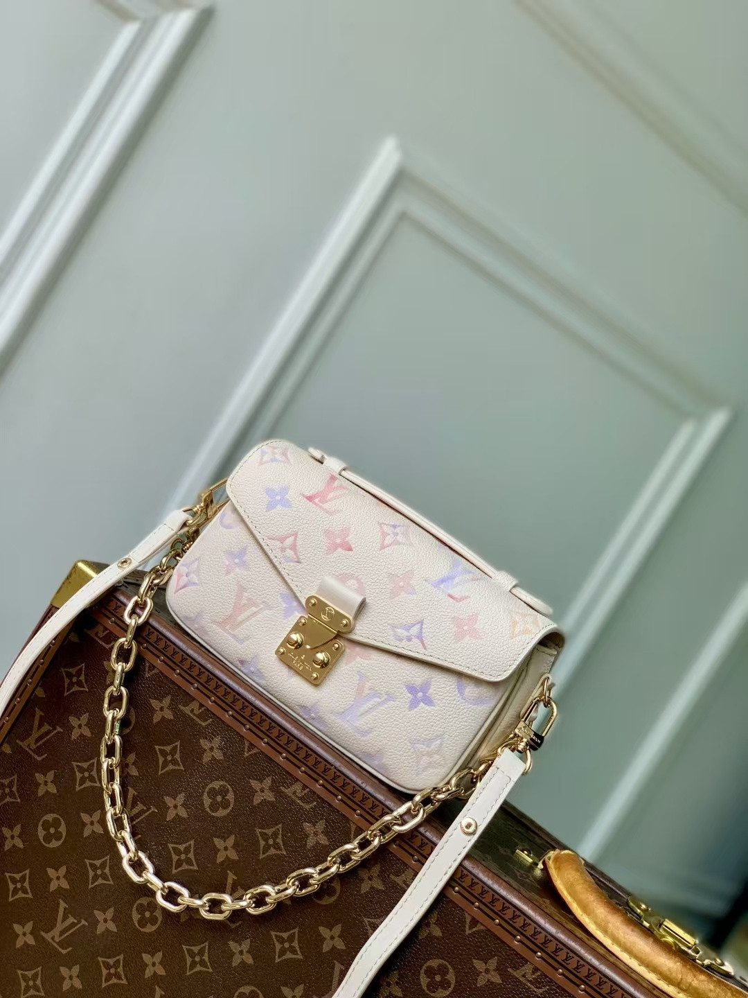 The Alma BB handbag has been reimagined as a new member of the Trunk collection, paying homage to the brand's rich travel heritage with its iconic logo. The bag is crafted from Monogram canvas with deep leather trim, accented with striking metal corner protectors and studs. This version features a detachable chain that can be used with the adjustable shoulder strap or separately.